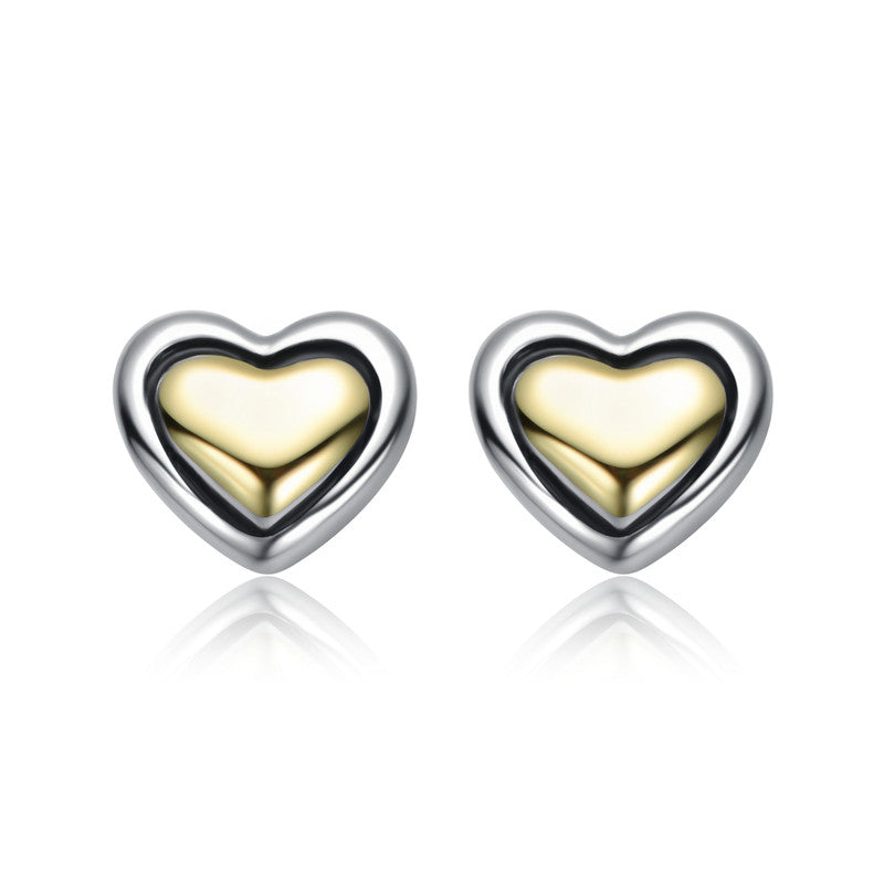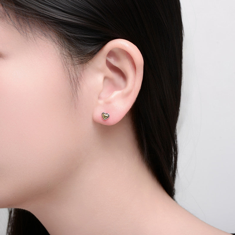Delicately crafted with elegance and charm, these stunning heart-shaped stud earrings feature a sleek two-tone design that beautifully blends modern sophistication with timeless allure. The outer edge is adorned with luminous white gold plating, offering a crisp, contemporary finish, while the inner heart glows with rich 14K gold plating, adding warmth and luxury to the piece. Their smooth, polished surface reflects light effortlessly, enhancing their graceful appeal.