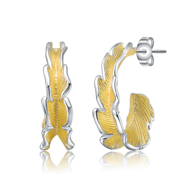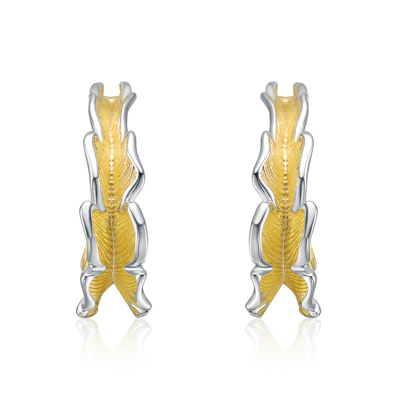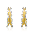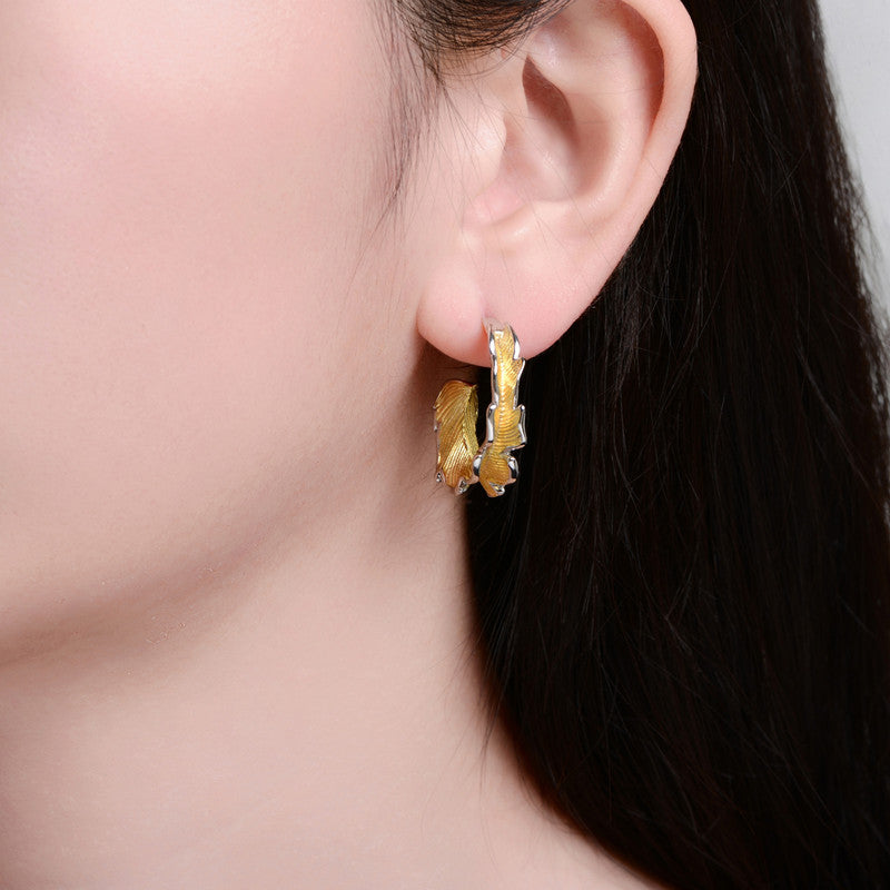 Two-Tone Unique Wavy Design Hoop Earrings. These beautiful Two-Tone Wavy Hoop Earrings elevate your elegance with a stunning fusion of 14K gold-plated and white gold-plated finishes. The fluid, flame-inspired silhouette is adorned, adding radiant sparkle to every curve. Crafted with precision, they offer lightweight comfort without compromising on statement style. Perfect for day-to-night wear, these hoops blend modern artistry with timeless charm- an exquisite choice for those who love bold yet graceful design.