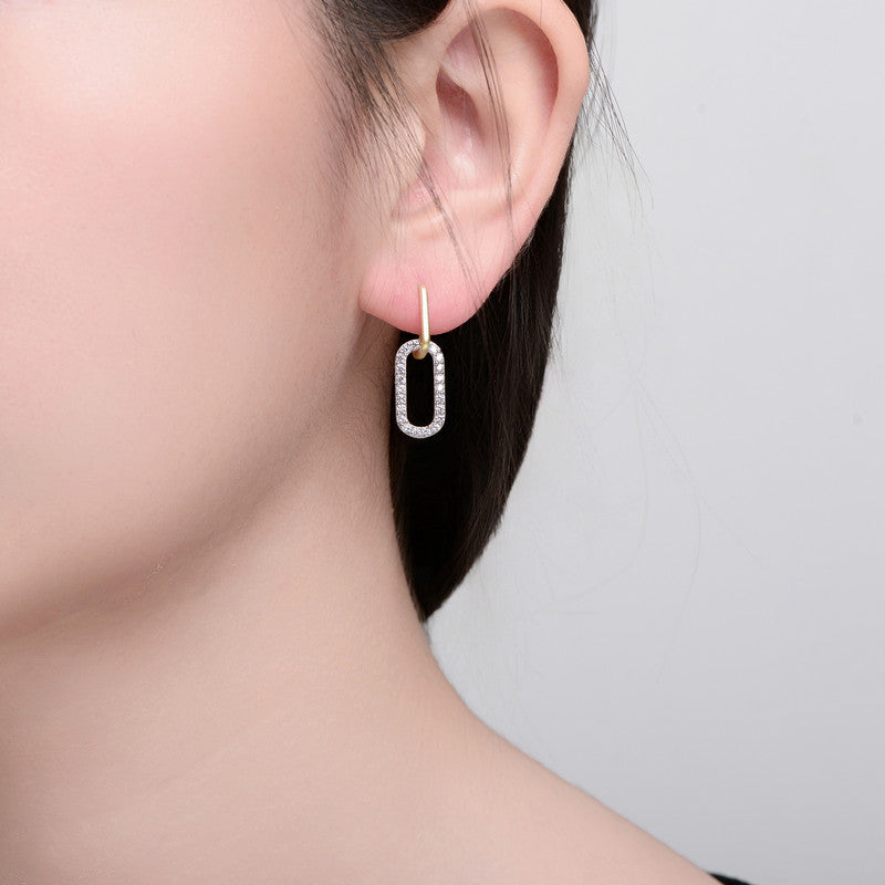 Two Tone with Clear Cubic Zirconia Drop Earrings. These beautiful earrings elevate your style with these elegant two-tone drop earrings, featuring a sophisticated 14K gold plating hook paired with a shimmering rectangular drop. Adorned with clear cubic zirconia stones, the outlined design adds a radiant touch, blending classic glamour with modern refinement. Perfect for any occasion, these earrings seamlessly complement day-to-evening looks. Their versatile appeal ensures a timeless addition to your collection.