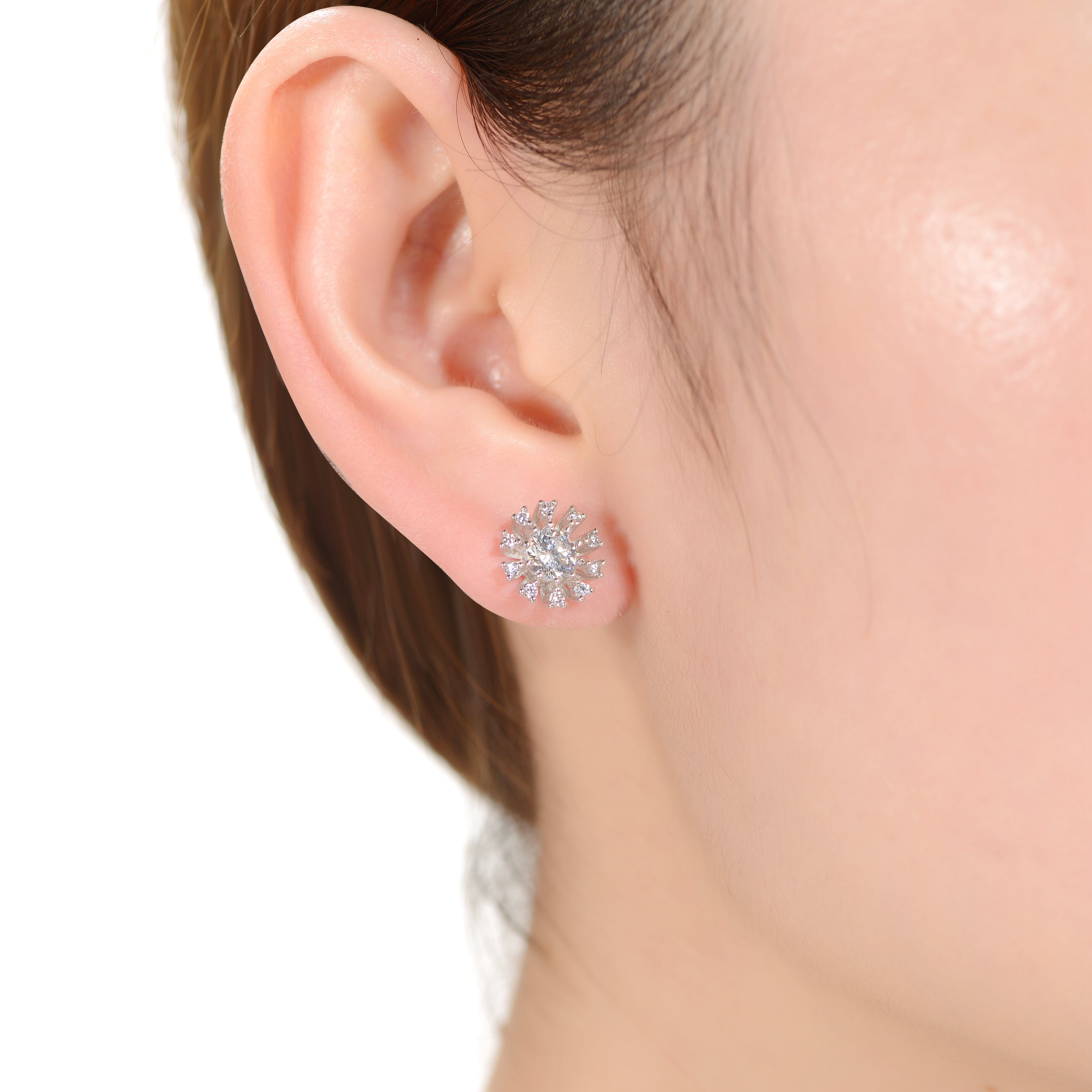 Show your charming side when you wear these eleagant White Gold Plated Earrings. The frisky wreath design is formed using clear round Cubic Zirconia as center surrounded with metal petals on each ens an clear round Cubic Zirconia. This pair is crafted in White Gold plating. It secures with a butterfly closure.