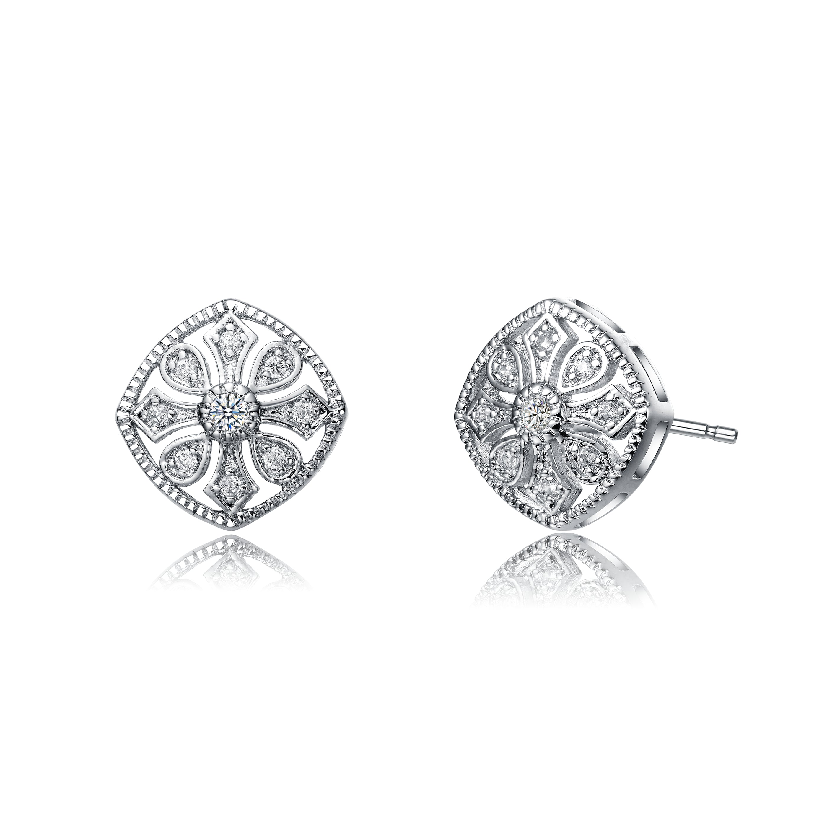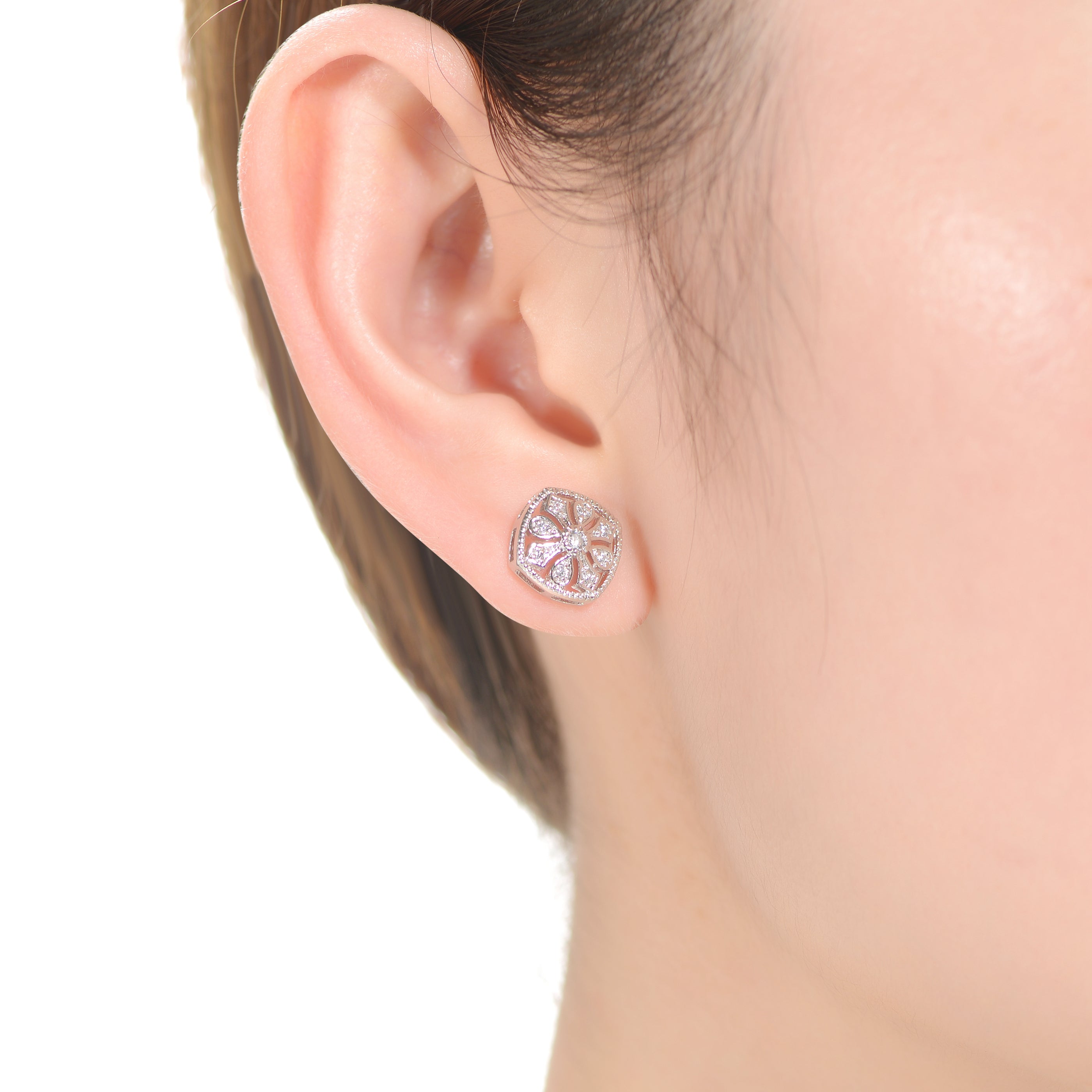 White Gold Plated with Cubic Zirconia Blooming Flower Filigree Stud Earrings. Flowers symbolize joy, change, and happiness, making these brightly polished white gold plated flower stud earrings more than just beautiful. Glittering round brilliant cut cubic zirconias prong set in a blooming flower adds an ornate quality to these geometric shapes. Textured edges give these filigree earrings dimension and intrigue. Butterfly backs keep these enchanting studs secure, making them great for mixing and matching with dangles and other studs.