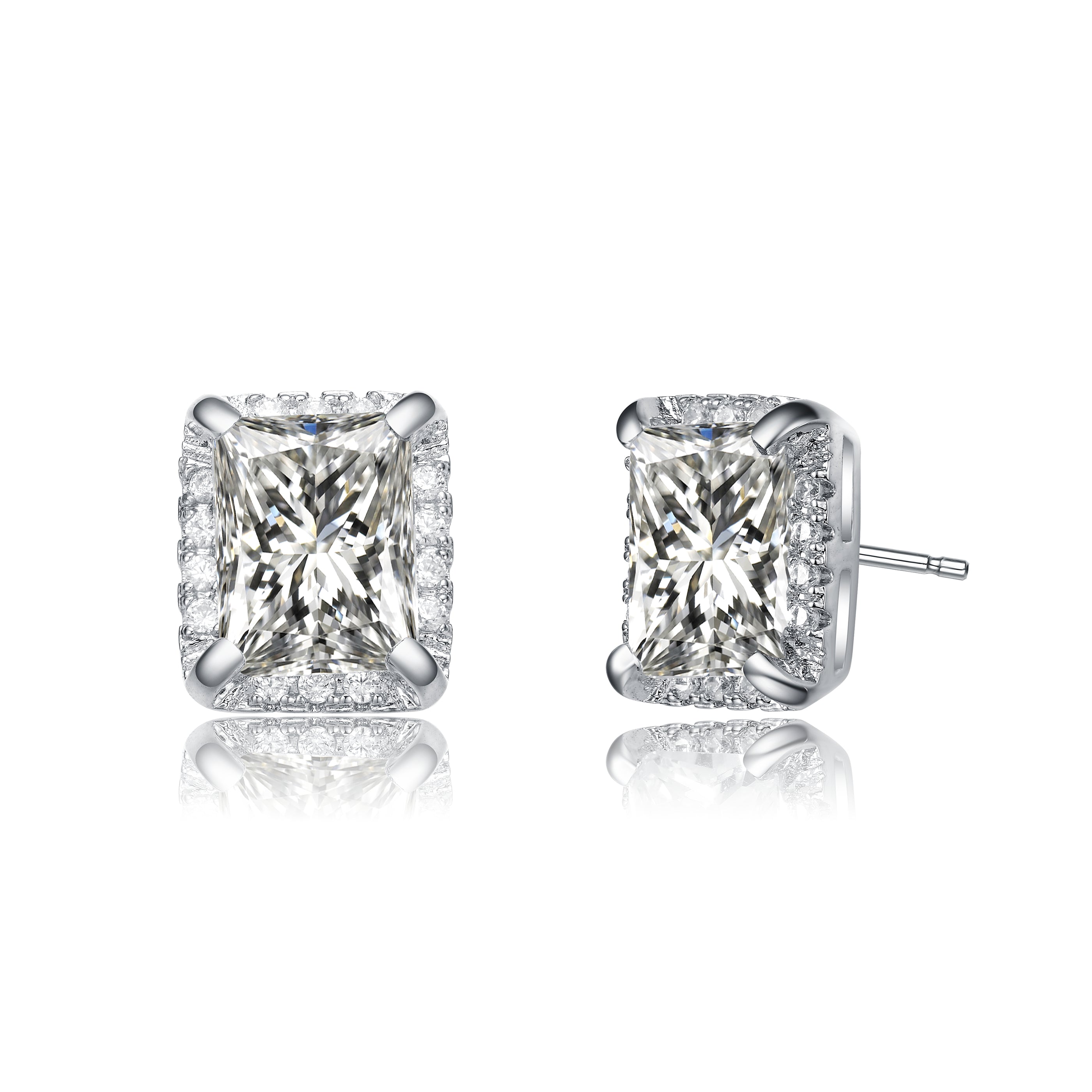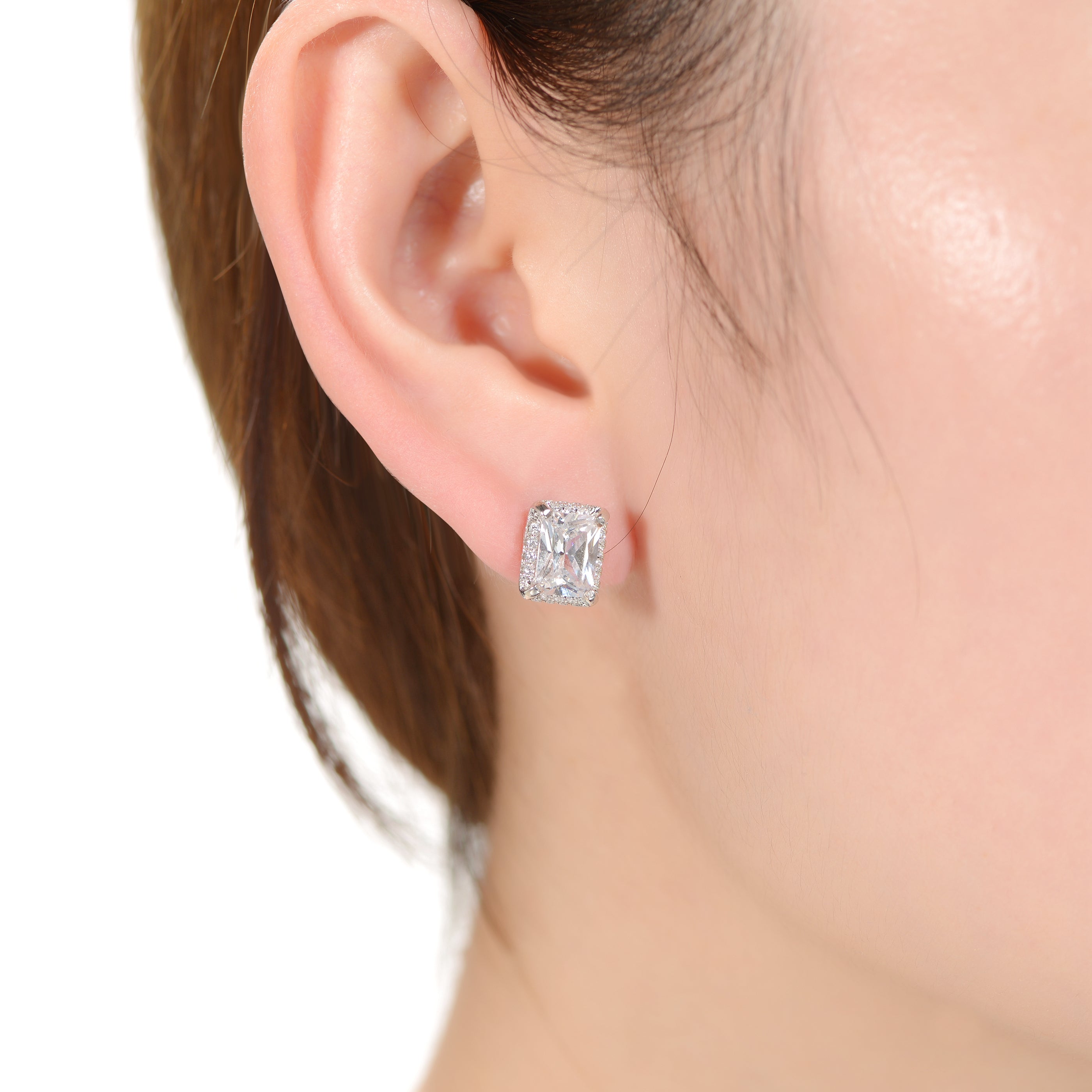 White Gold Plated with Cubic Zirconia Radiant Cut Hidden Halo Stud Earrings. These vintage-inspired white gold plated stud earrings feature radiant cut cubic zirconias secured in four-prong settings. Glittering round brilliant cut cubic zirconias frame each center stone in a hidden halo setting. Butterfly backs keep these beautiful studs secure. Make the most of your everyday look with a pair of studs made to get noticed yet understatedly elegant.