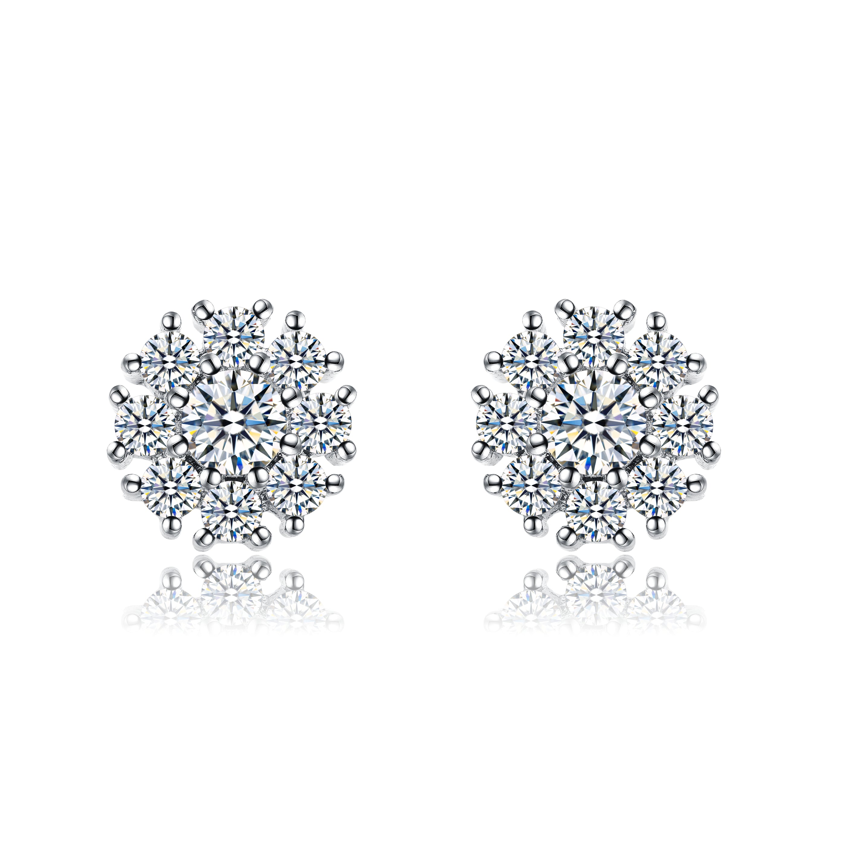 White Gold Plated with Cubic Zirconia Snowflake Cluster Stud Earrings. Add the glistening beauty of falling snowflakes to your wardrobe year-round by wearing these brightly polished white gold plated stud earrings. Round brilliant cut cubic zirconias secured in multi-prong settings nestle in each snowflake center. Round brilliant cut cubic zirconias prong set around them form a dazzling cluster reminiscent of sparkling winter icicles. Butterfly backs keep these pretty stud earrings secure.