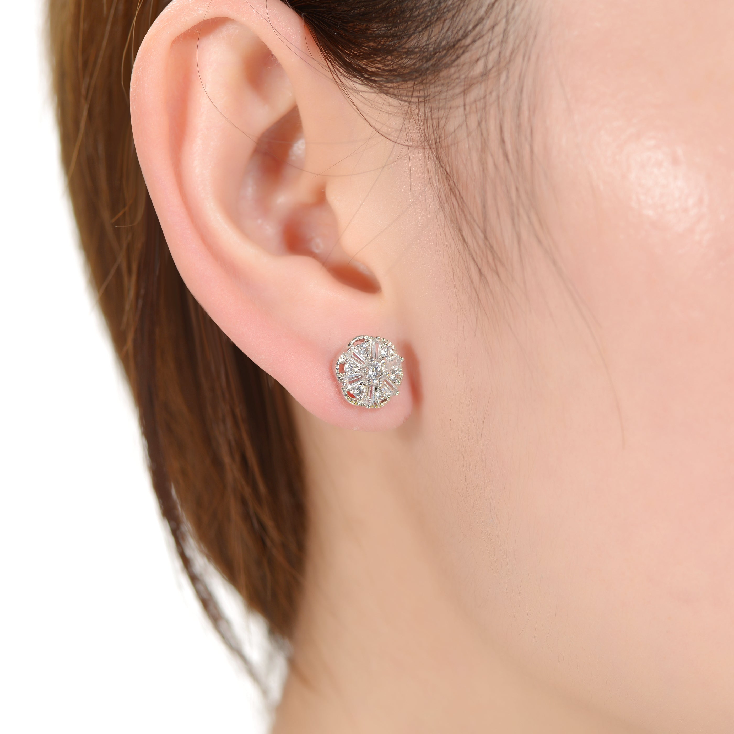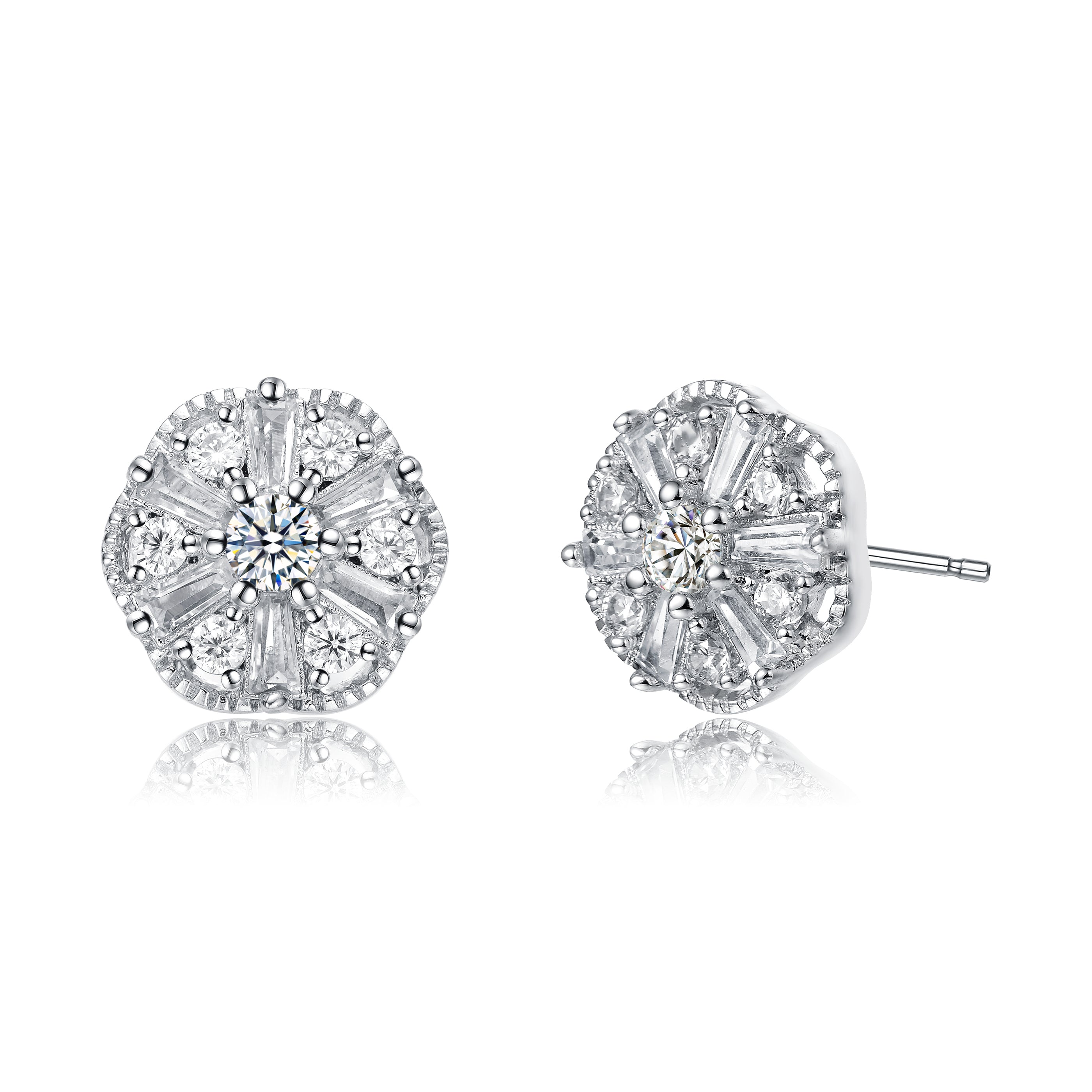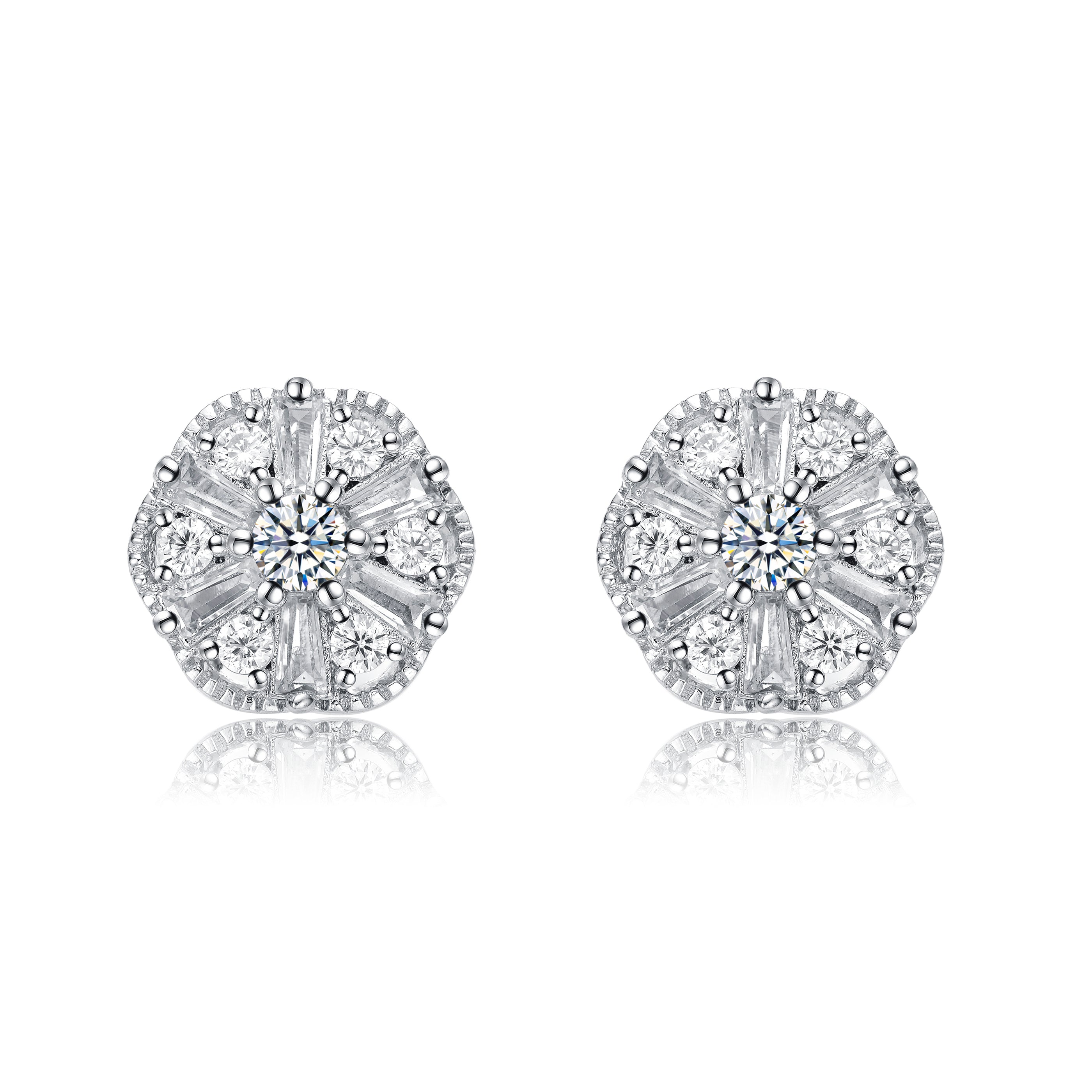 White Gold Plated with Cubic Zirconia Vintage Pinwheel Cluster Stud Earrings. Reinvent your style with these pretty white gold plated stud earrings featuring round brilliant cut cubic zirconias prong set in the center of pinwheel clusters with baguettes and additional round brilliant cut cubic zirconias. The -cut texture on the exterior lends dimension to these enchanting stud earrings, creating a highly detailed design. Butterfly backs keep these stud earrings secure.