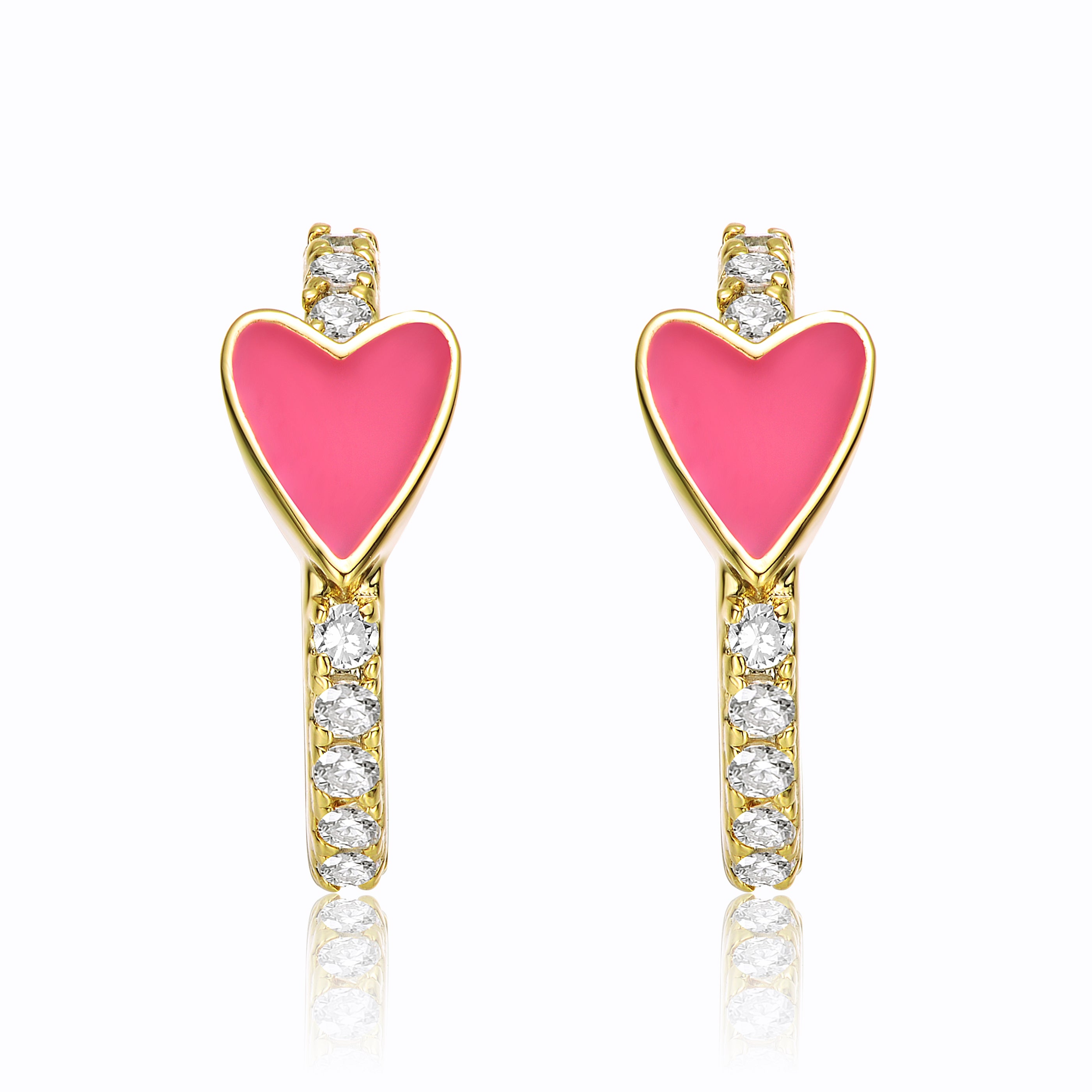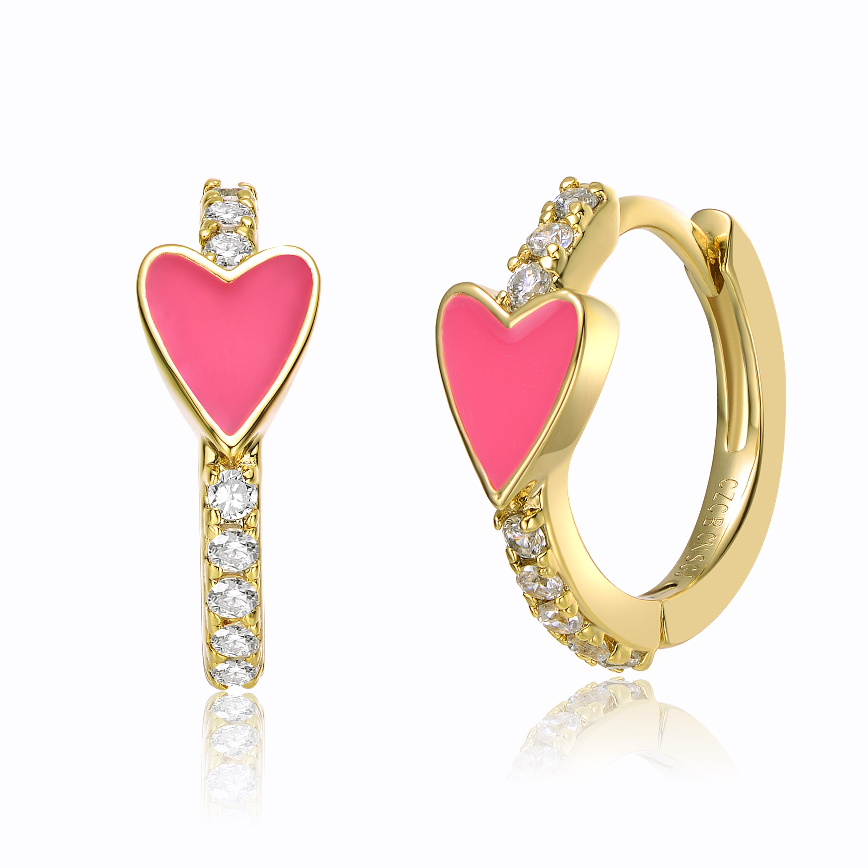 Young Adults/Teens 14k Yellow Gold Plated with Cubic Zirconia Pink Enamel Slim Hoop Earrings. Add hearts to your everyday life with these 14k yellow gold plated hoop earrings. Shiny enamel hearts on the front add joy, perfect for those who love color and chic style. Sparkling round brilliant cut cubic zirconias pave-prong set on the front of the hoops finish the look. Hinge backs keep these pretty hoops secure.